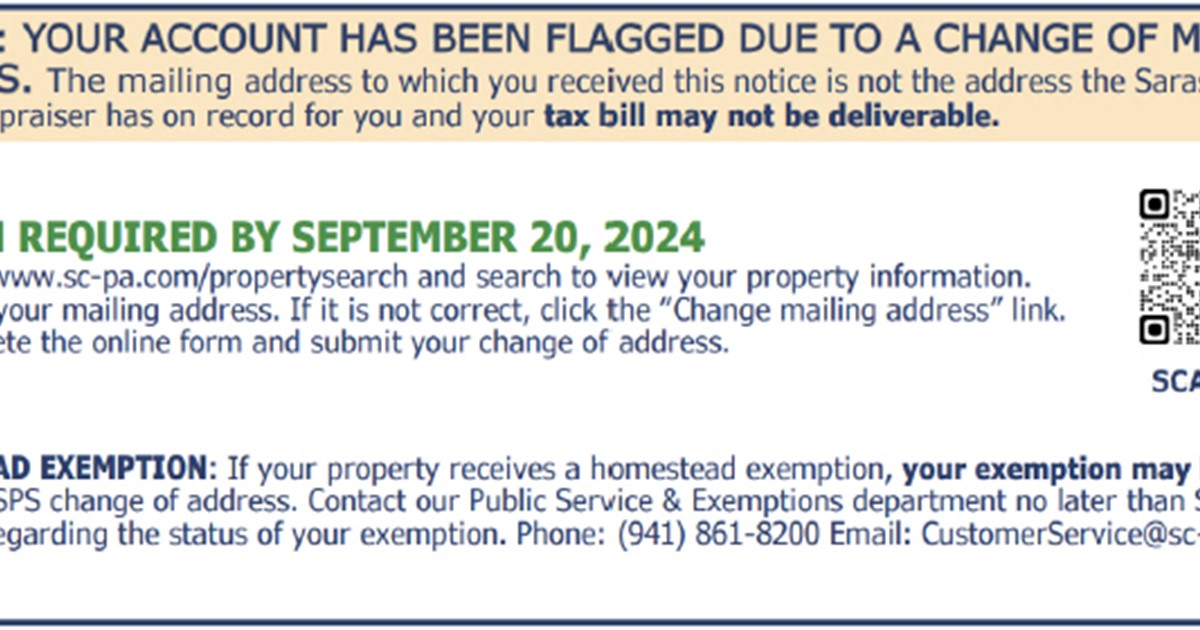 The Tax Collector is required to use the address on file in the Property Appraiser's records. This is why it is important to keep your mailing address updated with our office. You can also request an emailed copy of your tax bill. Follow this link to request e-billing from the Sarasota County Tax Collector. Note that E-billing only applies to tax bills from the Sarasota County Tax Collector. The Property Appraiser is required by law to mail the TRIM notice via first class USPS mail.